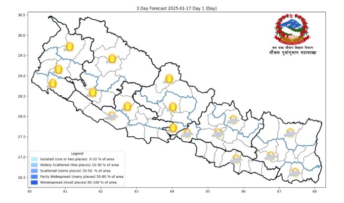दिउँसोमा कोशी, मधेश, बागमती र लुम्बिनी प्रदेशका केही स्थानमा आंशिक बदलीने सम्भावना रहेको छ। बाँकी क्षेत्रहरूमा भने मौसम सफा रहनेछ।