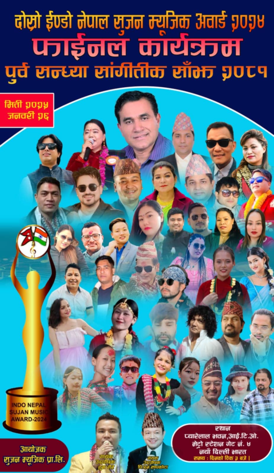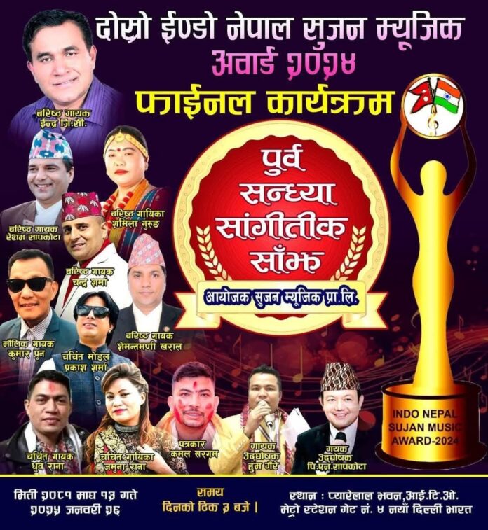 नयाँ दिल्ली = भारतको नयाँ दिल्लीमा यसवर्ष पनि ” दोस्रो ईन्डो नेपाल सुजन म्युजिक अवार्ड–२०२४” यहीँ २६ र २७ जनवरी आयोजना हुने भएको छ। यो अवार्ड कार्यक्रम सुजन म्युजिक प्रा.लि. द्वारा आयोजना गरिएको छ नेपाल र भारतका संगीतकर्मीहरूको नेपाली गीत संगीतप्रति गरेको योगदानलाई सम्मान गर्नु मुख्य उदेश्य रहेको आयोजकले जनाएको छ । अवार्ड कार्यक्रममा बिभिन्न ३३ विधामा पुरस्कार वितरण गरिने र विभिन्न सांगीतिक क्षेत्रका योगदानकर्ताहरूलाई पनि सम्मान गरिने संस्थाकी अध्यक्ष जमुना राना मगरले बताएकी छिन्।