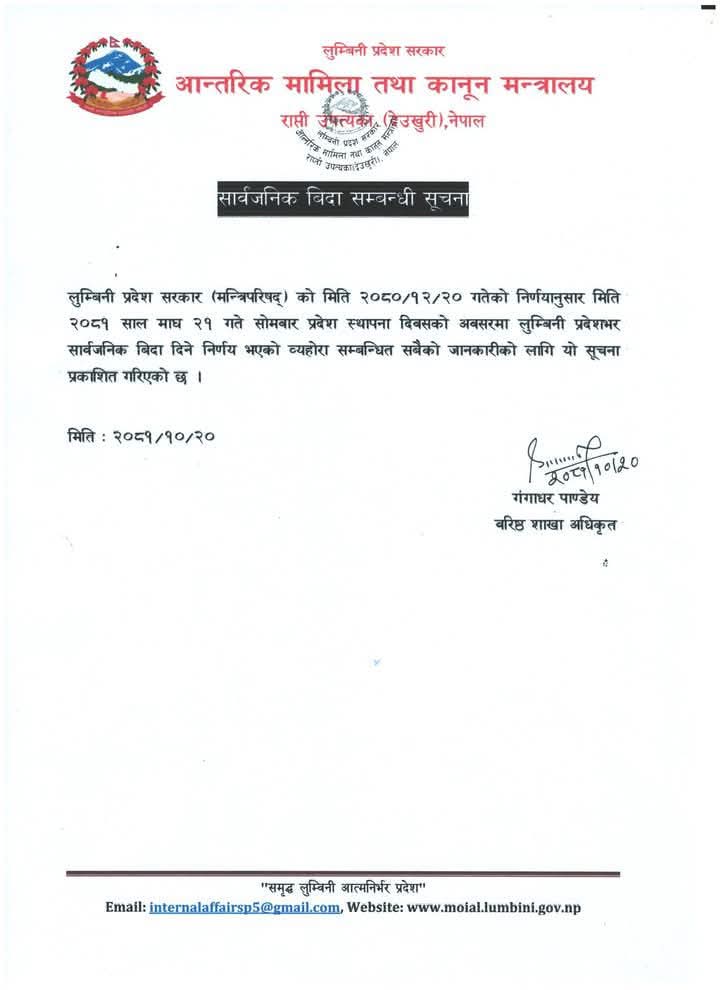 लुम्बिनी प्रदेश मा सोमबार सार्वजनिक बिदा