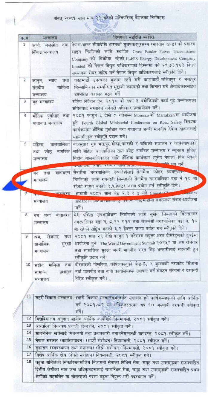 रुपन्देही सैनामैना, – नेपाल सरकारले सैनामैना नगरपालिका, रुपन्देहीको वडा नं. १० स्थित राष्ट्रिय वनको ३.५ हेक्टर जग्गा फोहोर व्यवस्थापन केन्द्र निर्माणका लागि प्रयोग गर्न स्वीकृति दिएको छ। मंगलबार बसेको मन्त्रिपरिषद बैठकले उक्त निर्णय गरेको हो, जसले बर्षौदेखि भोगाधिकार अभावमा रोकिएको फोहोर व्यवस्थापनको काम अघि बढाउने बाटो मन्त्रीपरिषद बैठकले खुल्ला गरेको छ