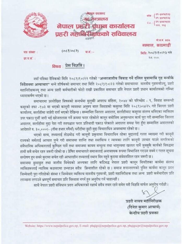 यसअघि सार्वजनिक समाचारमा गृह मन्त्रालयको निर्देशन अनुसार अन्तरजातीय विवाह गरेका युवामाथि प्रहरी कारबाही गरिरहेको दाबी गरिएको थियो, जसलाई नेपाल प्रहरीले पूर्णरूपमा अस्वीकार गरेको छ। प्रहरीका अनुसार समाजमा कानुनी शासन कायम राख्न, न्याय सम्पादन गर्न तथा अपराध अनुसन्धानलाई निष्पक्ष बनाउन आफ्नो कार्य जारी राख्ने प्रतिवद्धता समेत व्यक्त गरेको छ।