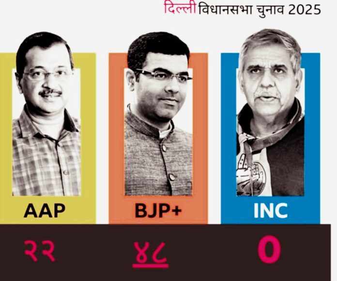 नयाँ दिल्ली – दिल्लीमा भारतीय जनता पार्टी (भाजपा) ले ऐतिहासिक जीत हात पार्दै सत्तारूढ आम आदमी पार्टी (आप) लाई पराजित गरेको छ। झन्डै एक दशकदेखि दिल्लीको सत्तामा रहेका मुख्यमन्त्री अरविन्द केजरीवाल र उनकी पार्टीलाई पराजित गर्दै भाजपाले पूर्ण बहुमत प्राप्त गरेको हो। निर्वाचन आयोगको प्रारम्भिक नतिजाका अनुसार, दिल्ली विधानसभा चुनावमा भाजपाले ४८ सिट जित्न सफल भयो भने, आप २२ सिटमा सीमित रहि चित्त बुझाउनु परेको छ । दिल्लीमा सरकार गठनका लागि आवश्यक न्यूनतम ३६ सिटको बहुमत पार गर्दै भाजपाले सरकार गठनको तयारी गरेको छ।