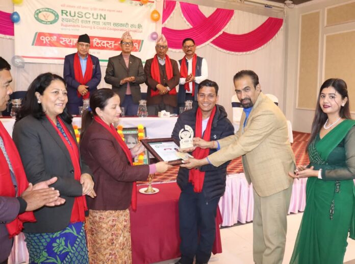 बुटवल, – नेपाल पत्रकार महासंघ रुपन्देहीको संयोजनमा रुपन्देही बचत तथा ऋण सहकारी संस्था लिमिटेडबाट प्रदान गरिने ‘उत्कृष्ठ सहकारी पत्रकारिता पुरस्कार २०८१’ बाट बुटवल टुडे राष्ट्रिय दैनिकका उप–सम्पादक तथा कृषि पत्रकार महासंघ लुम्बिनी प्रदेशका अध्यक्ष कृष्ण खनाल पुरस्कृत भएका छन् । पत्रिकाको संस्थापनकाल देखि कार्यरत खनाल कृषि, सहकारी र समसमायीक विषयमा कलम चलाउँदै आएका छन् । उप–सम्पादक खनाललाई नेपाली काग्रेस लुम्बिनी प्रदेश सभा प्रमुख सचेतक प्रदेश सभा सदस्य जमुना ढकाल, रुपन्देही बचत तथा ऋण सहकारी संघका अध्यक्ष बसन्त प्रसाद ढकाल, लुम्बिनी प्रदेश विशिष्ठकृत सहकारी संस्था लिमिटेडका अध्यक्ष ज्ञानु पौडेल सहितले नगद सहित सम्मान तथा पुरस्कृत गरेका हुन ।रुपन्देही बचत तथा ऋण सहकारी संस्थाको १९ औ स्थापना दिवसको अवसारमा आयोजित विशेष समारोहमा उक्त पुरस्कार प्रदान गरिएको हो ।