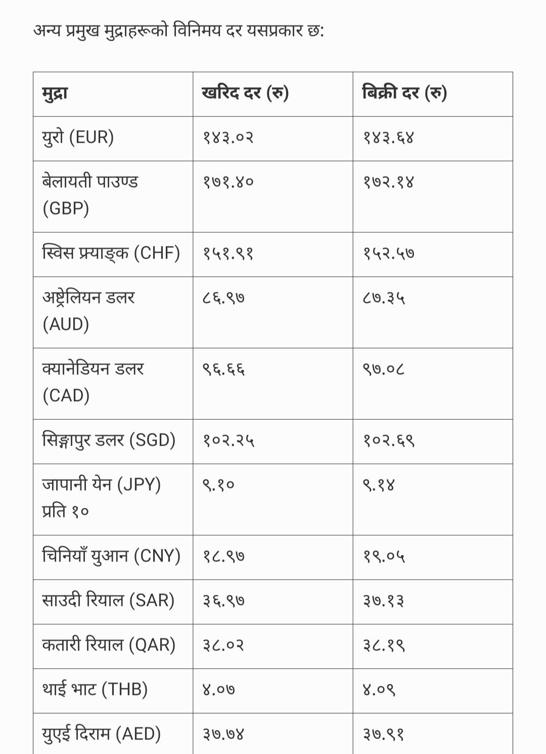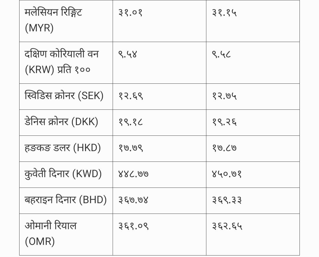 काठमाडौं। नेपाल राष्ट्र बैंकले आज माघ ३०, २०८१ (फेब्रुअरी १२, २०२५) का लागि विदेशी मुद्राको विनिमय दर सार्वजनिक गरेको छ। यसअनुसार, अमेरिकी डलरको मूल्यमा केही गिरावट आएको छ। हिजो अमेरिकी डलर एकको खरिद दर १३९ रुपैयाँ ६७ पैसा र बिक्री दर १४० रुपैयाँ २७ पैसा थियो भने आज यो घटेर क्रमशः १३८ रुपैयाँ ६३ पैसा र १३९ रुपैयाँ २३ पैसा पुगेको छ।