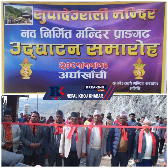 अर्घाखाँची – अर्घाखाँची जिल्लाको सुपा देउराली मन्दिरमा उल्लेखनीय पूर्वाधार विकास हुँदै गएको छ । धार्मिक र ऐतिहासिक महत्त्व बोकेको यस मन्दिरको नवनिर्मित प्राङ्गण आज एक भव्य समारोहबीच उद्घाटन गरिएको छ । लुम्बिनी प्रदेश सभा सदस्य रामजी प्रसाद घिमिरेले उद्घाटन गर्दै सोच, संकल्प, र दृढ इच्छाशक्ति भए विकास असम्भव नरहेको बताउनुभएको छ।