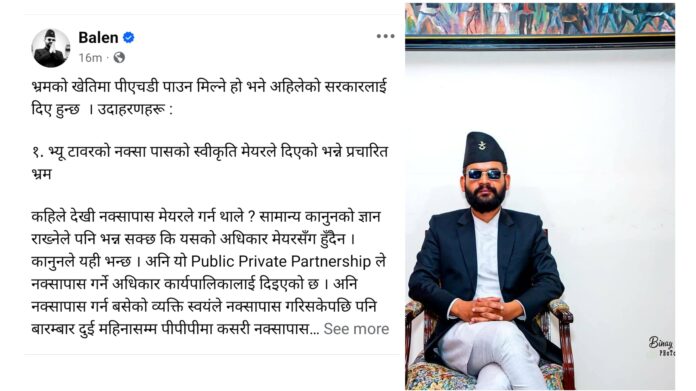 कहिले देखी नक्सापास मेयरले गर्न थाले ? सामान्य कानुनको ज्ञान राख्नेले पनि भन्न सक्छ कि यसको अधिकार मेयरसँग हुँदैन । कानुनले यही भन्छ । अनि यो Public Private Partnership ले नक्सापास गर्ने अधिकार कार्यपालिकालाई दिइएको छ । अनि नक्सापास गर्न बसेको व्यक्ति स्वयंले नक्सापास गरिसकेपछि पनि बारम्बार दुई महिनासम्म पीपीपीमा कसरी नक्सापासको काम गराउने भन्ने विषयमा बैठक बसेको प्रमाण हामीसँग सुरक्षित छ ।