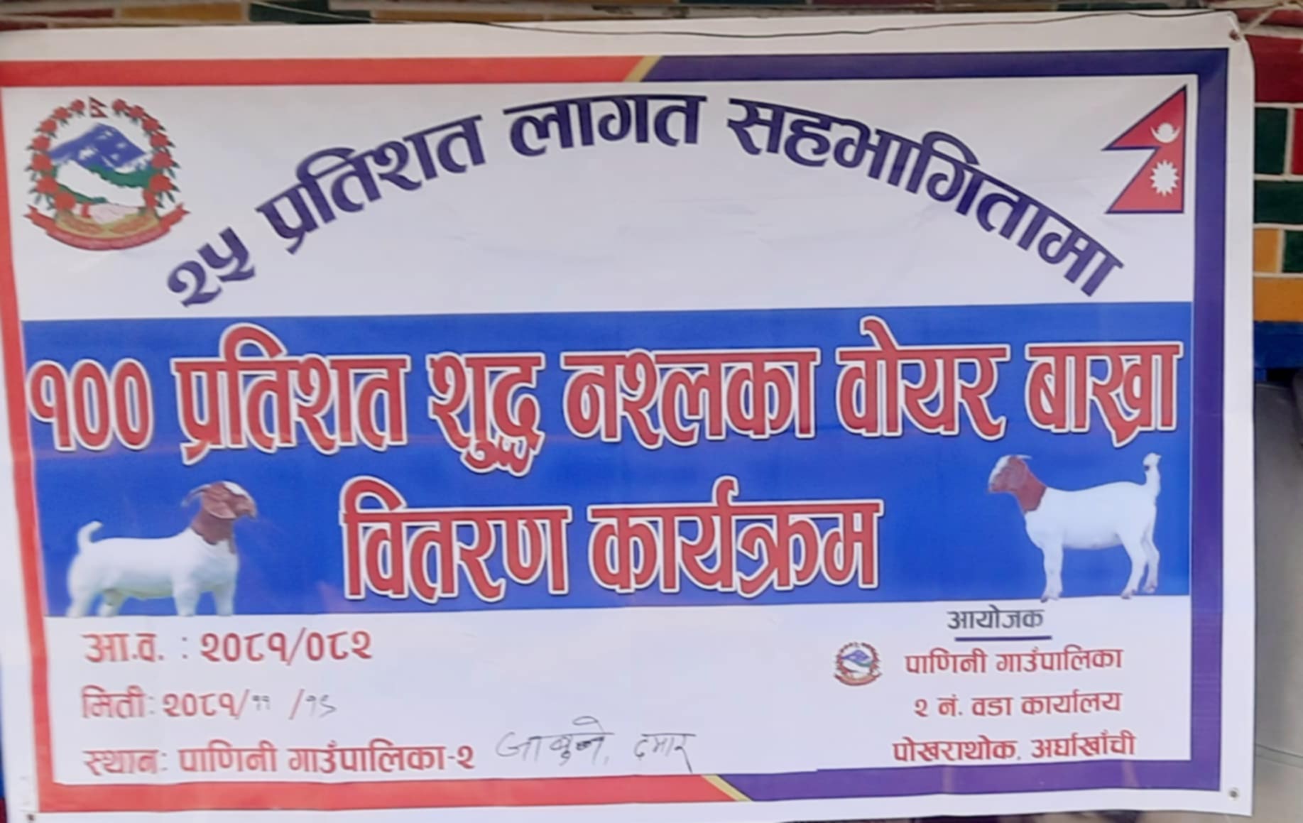 स्थानीय कृषकहरूको आर्थिक सशक्तीकरण र पशुपालन प्रवर्द्धन गर्ने उद्देश्यले पाणिनी गाउँपालिका–२ पोखराथोकमा १००% शुद्ध बोयर बाख्रा वितरण गरिएको छ। कृषकहरूलाई २५% लागत साझेदारीमा सहभागी गराउँदै वडाध्यक्ष चन्द्रकान्त पौडेलको नेतृत्वमा कार्यक्रम सम्पन्न भएको हो।