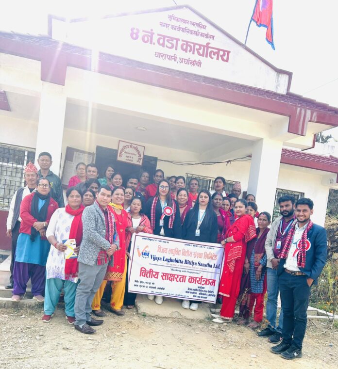 अर्घाखाँची – विजय लघुवित्त वित्तीय संस्था लिमिटेडले अर्घाखाँची जिल्लाको भुमिकास्थान नगरपालिकाको धारापानीमा फाल्गुन २८ गते “वित्तीय साक्षरता कार्यक्रम”सम्पन्न गरेको छ। वित्तीय साक्षरता हाम्रो दैनिक जीवन सङ्ग जोडिएको विषय साथै वित्तीय स्थायित्वको आधारशिल पनि भएको हुँदा वित्तीय प्रणालीप्रति विश्वास कायम राख्न र आर्थिक गतिविधिहरुलाई वित्तीय प्रणालीमा समाबेश गर्न ,समुदायमा वित्तीय सचेतना जगाउने उदेश्य राखी उक्त कार्यक्रम आयोजना गरिएको हो ।