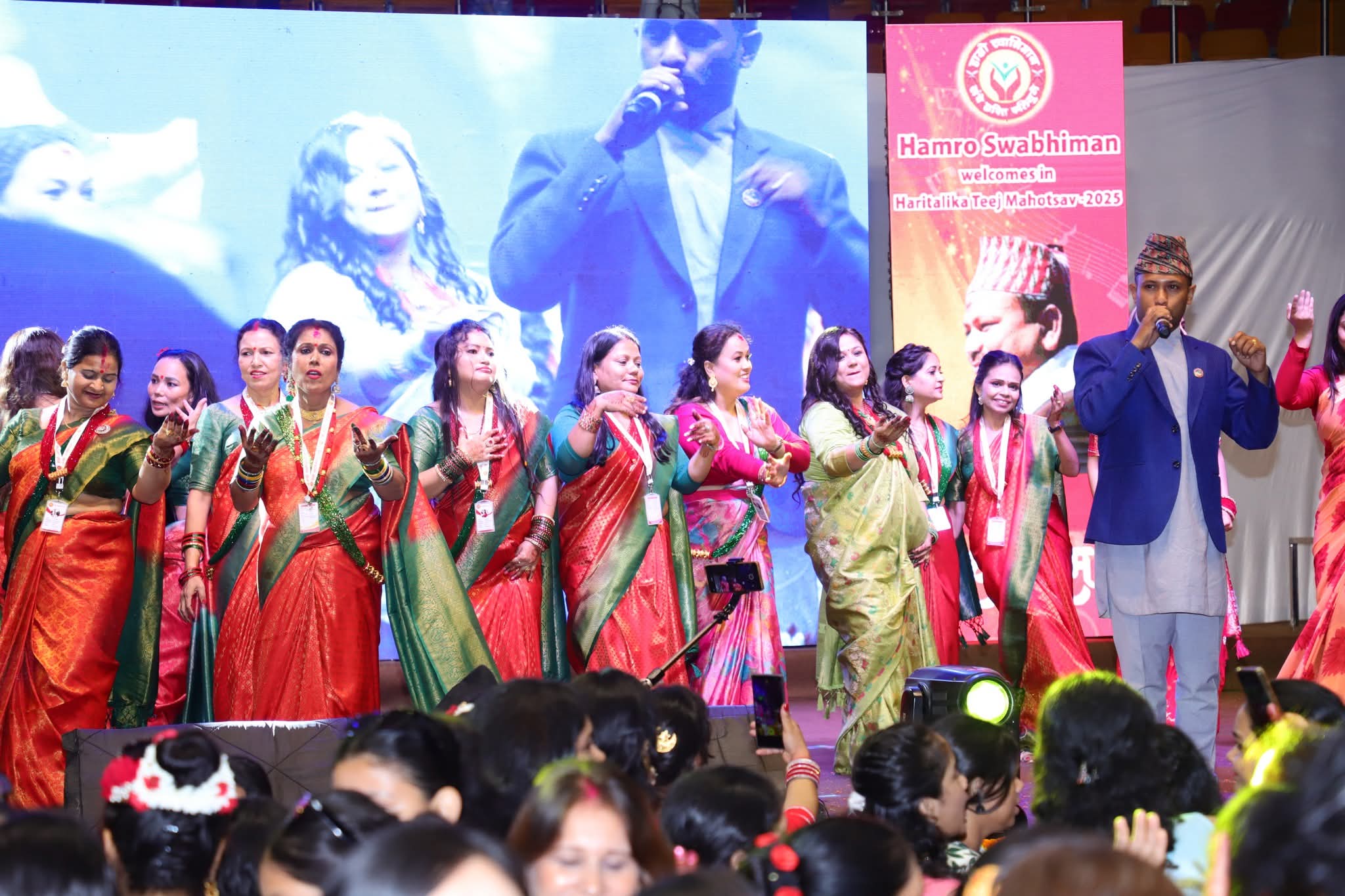 अर्जुन थापा, नयाँ दिल्ली । हाम्रो स्वाभिमान ट्रस्टले यस वर्ष पनि भव्य ढंगले १२औं हरितालिका तीज महोत्सव तथा राष्ट्रिय सम्मान कार्यक्रम सम्पन्न गरेको छ । (अगस्त २६, २०२५) का दिन नयाँ दिल्लीको तालकटोरा इनडोर स्टेडियम हजारौं नेपाली भाषी दिदीबहिनी, दाजुभाइ र अभिभावकको भीडले भरिएको थियो । कार्यक्रमको सुरुवातैमा अशोक ठाकुर, दिल्लीका विधायक अनिल शर्मा, डीसीएम सुरेन्द्र थापा, समाजसेवी अजय बंसल, कंचन गुरुङ र ट्रस्टका अध्यक्ष नारायण श्रेष्ठले संयुक्त रूपमा दीप प्रज्वलन गरेर तीज महोत्सवको शुभारम्भ गर्नु भएको थियो ।