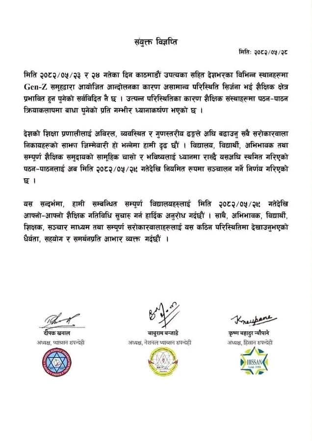 विज्ञप्तिमा निकाल्दै , “देशको शिक्षा प्रणालीलाई अविरल, व्यवस्थित र गुणस्तरीय बनाउनुपर्ने जिम्मेवारी हामी सबैमा हुन्छ। विद्यालय, विद्यार्थी, अभिभावक तथा सम्पूर्ण शैक्षिक समुदायको सामूहिक चासो र भविष्यलाई ध्यानमा राखी असामान्य परिस्थितिबाट अवरुद्ध पठन–पाठनलाई मिति २०८२ भदौ २९ गतेदेखि नियमित सञ्चालन गर्ने निर्णय गरिएको उल्लेख गरिएको छ ।