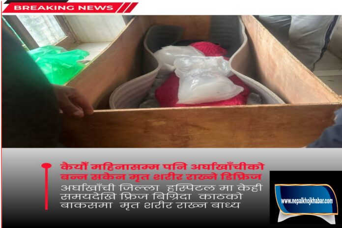 अर्घाखाँची । अर्घाखाँची जिल्ला अस्पतालमा शव राख्ने फ्रिज महिनौँदेखि बिग्रिएको छ । मृतकलाई सुरक्षित राख्ने फ्रिज नभएपछि अहिले पनि आफन्तहरू काठको बाकसमा आइस राखेर शव सुरक्षित राख्न बाध्य भएका  छन् ।