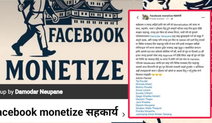यस्तै ग्रुपहरूमध्ये हाल ‘Facebook Monetize सहकार्य’ नामक फेसबुक ग्रुप अत्यन्त सक्रिय देखिएको छ। उक्त ग्रुपमा हाल एक लाख पाँच हजारभन्दा बढी सदस्य आवद्ध छन् भने २ जना एडमिन र १२ जाना ग्रुपका modeator रहेको सागर खड्का क्षेत्रीले नेपाल खोज खबर लाई जानकारी दिँदै ग्रुपमार्फत प्रयोगकर्ताहरूलाई मोनेटाइजेसनका मापदण्ड पूरा गर्न सहकार्य भइरहेको बताए।