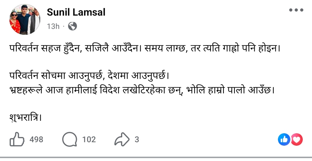 उनले परिवर्तनको सुरुवात सोचबाट हुनुपर्ने र त्यसपछि देशमा देखिनुपर्ने उल्लेख गरेका छन्। “परिवर्तन सोचमा आउनुपर्छ, देशमा आउनुपर्छ,” उनले लेखेका छन्।