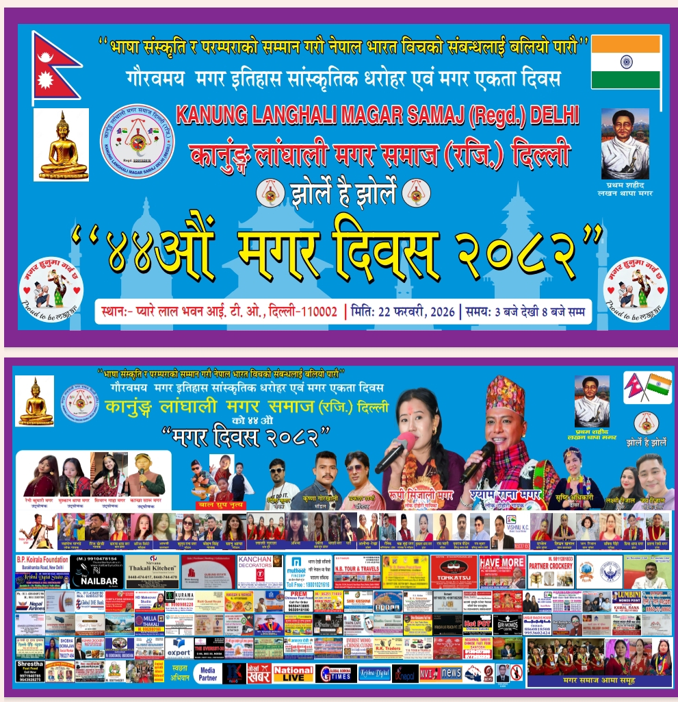 मगर समुदायको गौरवशाली इतिहास, वीरता, बलिदान र सांस्कृतिक पहिचानलाई उजागर गर्दै प्रवासमा रहेका नेपालीहरूलाई एकताबद्ध गर्ने लक्ष्यसहित कार्यक्रम आगामी फेब्रुअरी २२, २०२६ का दिन प्यारे लाल भवन, आई.टी.ओ., दिल्लीमा दिउँसो ३ बजेदेखि साँझ ७ बजेसम्म सञ्चालन गरिने संस्थाका अध्यक्ष फर्स बहादुर थापाले नेपाल खोजखबर लाई बताउनु भएको छ ।