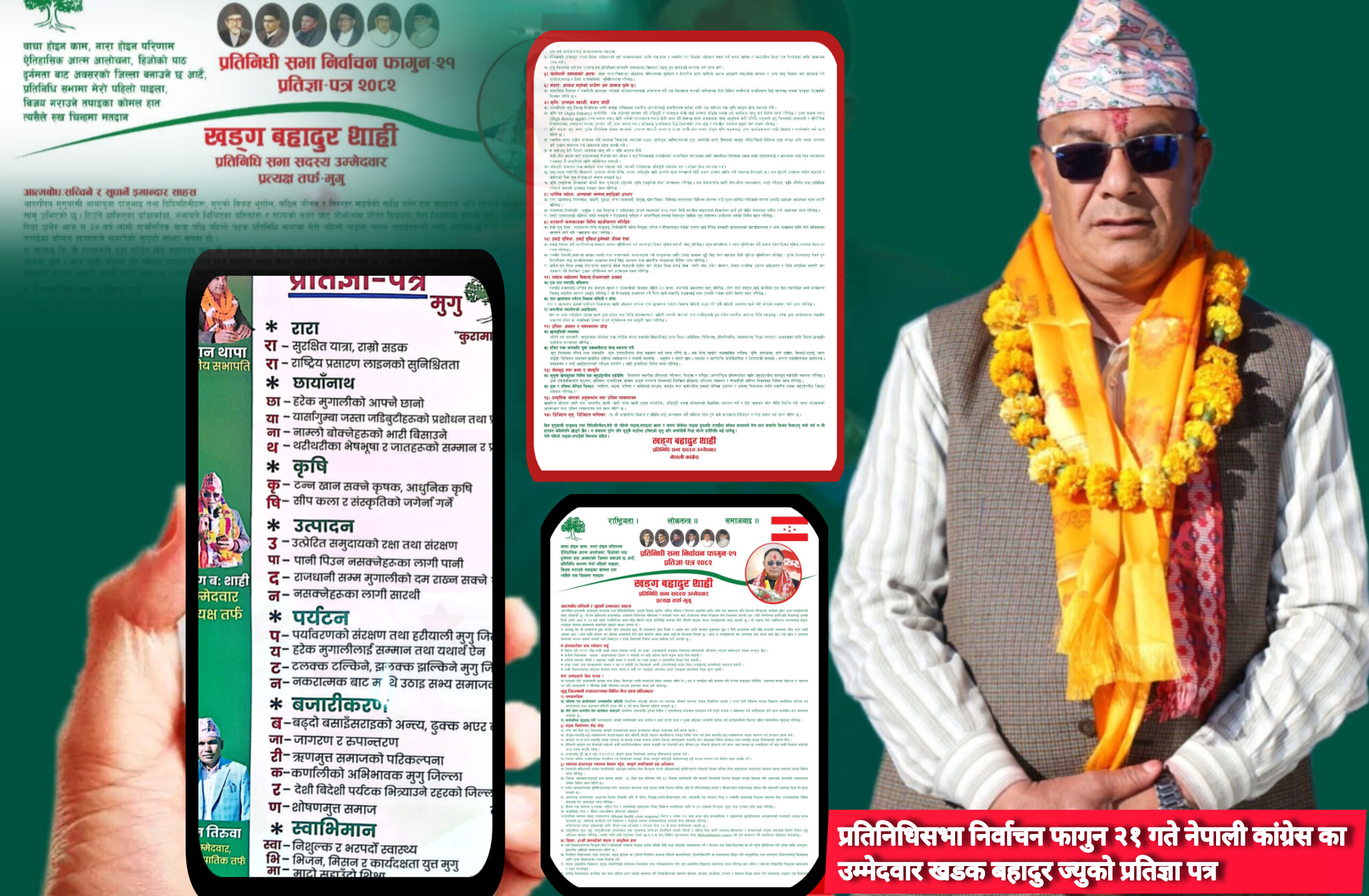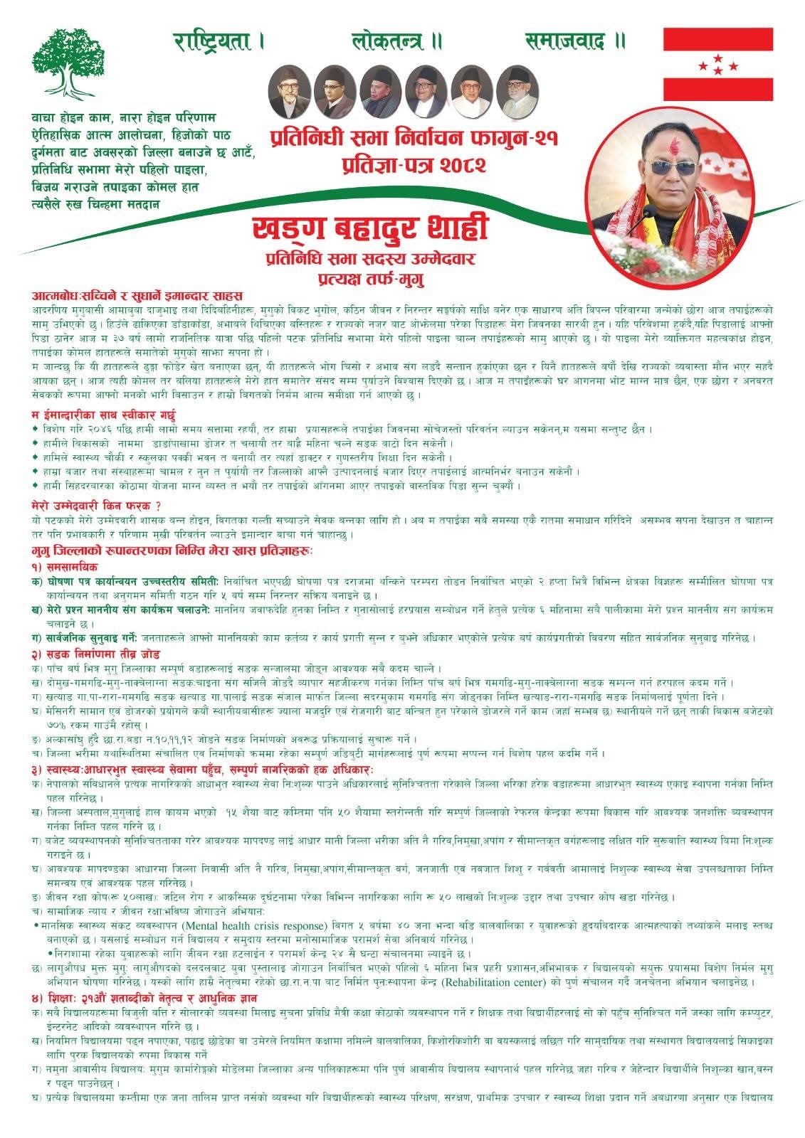 प्रतिनिधि सभा निर्वाचन नजिकिँदै जाँदा मुगुमा चुनावी माहोल तिव्र रुपमा तातिदै गएको छ । निर्वाचनका लागि उम्मेदवार दिएका दलहरुले आआफ्ना प्रतिज्ञा पत्र सार्वजानिक गर्दे नेपाली कांग्रेसका प्रतिनिधिसभा उम्मेदवार खड्ग बहादुर शाहीले आफ्नो विस्तृत प्रतिज्ञा–पत्र सार्वजनिक गरेका छन् । आज पत्रकार सम्मेलन गर्दे उनले आफ्नो मुगु विकासको लागि प्रतिज्ञा पत्र सार्वजानिक गरेका हुन ।