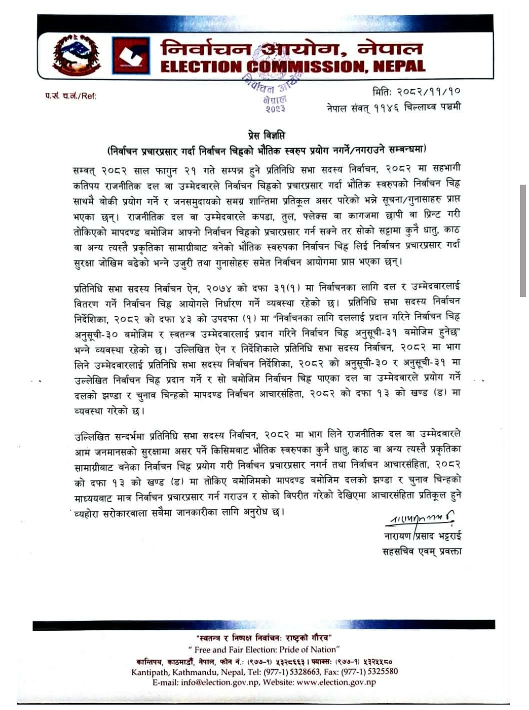 कतिपय राजनीतिक दल वा उम्मेदवारले निर्वाचन चिह्नको प्रचारप्रसार गर्दा भौतिक स्वरूपको निर्वाचन चिह्न साथमै बोकी प्रयोग गर्ने र जनसमुदायको समग्र शान्तिमा प्रतिकूल असर पारेको भन्ने सूचना र गुनासाहरू प्राप्त भएको भन्दै दल तथा उम्मेदवारलाई आग्रह गरिएको आयोगका प्रवक्ता नारायणप्रसाद भट्टराईले बताएका हुन ।