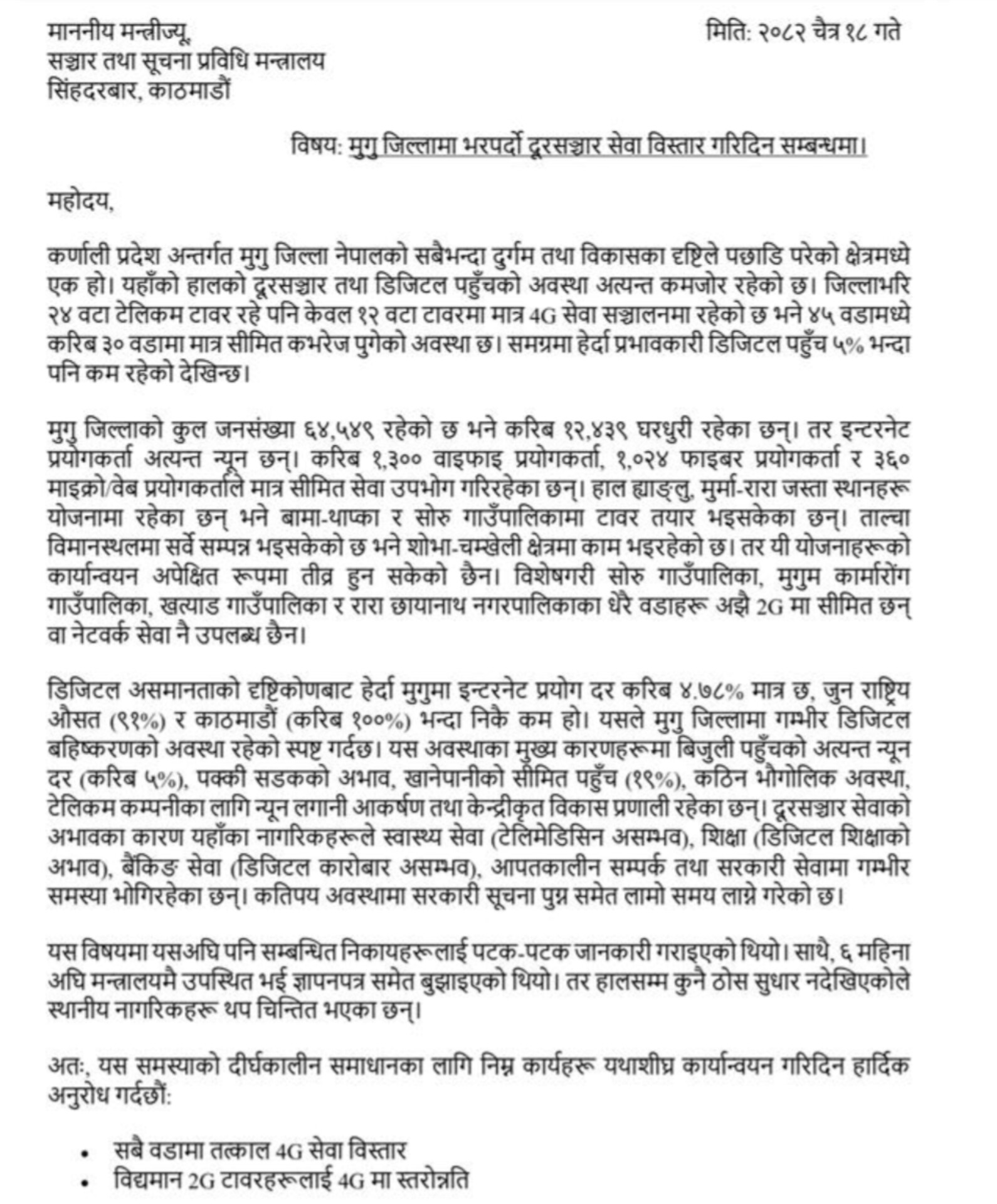 प्रस्तुत तथ्यांकअनुसार मुगु जिल्लामा रहेका २४ टेलिकम टावरमध्ये केवल १२ वटामा मात्र 4G सेवा सञ्चालनमा रहेको छ भने बाँकी स्थानमा अझै 2G वा कमजोर नेटवर्कमै नागरिक निर्भर छन्। ४५ वडामध्ये करिब ३० वडामा मात्र सीमित कभरेज पुगेको छ र प्रभावकारी इन्टरनेट पहुँच ५ प्रतिशतभन्दा कम रहेको जुन दक्षिण अफ्रिकि राष्ट्र सोमालिया भन्दा कम रहेको उल्लेख गरिएको छ। ६४ हजारभन्दा बढी जनसंख्या रहेको जिल्लामा इन्टरनेट प्रयोगकर्ता अत्यन्त न्यून रहेको र धेरै नागरिक अझै डिजिटल सेवाबाट वञ्चित रहेको अवस्था छ।यसै सन्दर्भमा युवाहरूले मन्त्रालयमा बुझाएको ज्ञापनपत्रमा मुगुका करिब ९५ प्रतिशत नागरिक अझै भरपर्दो इन्टरनेट सेवाबाट वञ्चित रहेको, गाउँसम्म सरकारी सूचना नपुगेको तथा 4G सेवा विस्तारमा कर्णालीलाई पर्याप्त प्राथमिकता नदिएको र जसका कारण मुगुको ६०% नागरिक गाउँबाट शहरि क्षेत्रमा बसाइँसराई भएको र अझै पनि सरकारले केही उपाय अपनाएर जान नसके गाउँ खाली हुने गुनासो गरेका छन्। उनीहरूले कतिपय स्थानमा मोबाइल सिग्नल पाउन डाँडामा पुग्नुपर्ने बाध्यता रहेको उल्लेख गर्दै तत्काल सुधारको माग गरेका छन्।भेटका क्रममा युवाहरूले प्रतीकात्मक रूपमा पुरानो नोकिया मोबाइल फोन मन्त्रीलाई उपहार दिएका थिए। तर मन्त्री तिमल्सिनाले उक्त उपहार अस्वीकार गरेका थिए। यस घटनाले दुर्गम क्षेत्रको डिजिटल विभेदप्रति युवाहरूको असन्तुष्टि झल्काएको छ।