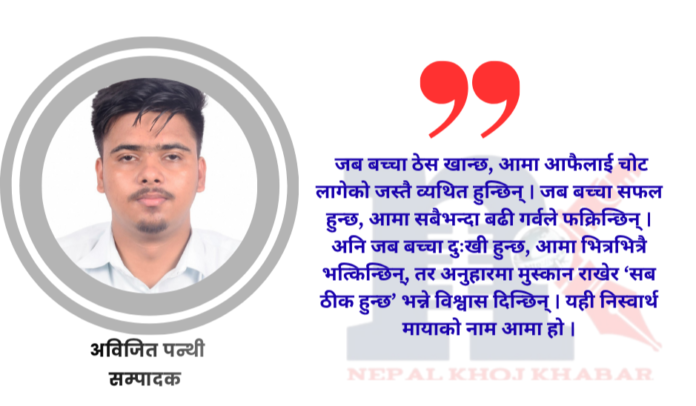 आमा भनेको केवल जन्म दिने मात्र होइन, आमा भनेको साँचो मित्र हो, सबैभन्दा ठूलो गुरु हो, कहिल्यै शर्त नलगाउने प्रेमीनी हो। आमा त्यो छन् जसले कहिल्यै तपाईंसँग कुनै सर्त राखेर माया गर्नुहुन्न। आमा त्यो छन् जसले तपाइँका सबै गल्ती माफ गर्नुहुन्छ र फेरि पनि तपाइँलाई काखमा अटाउने ठाउँ दिनुहुन्छ। संसारमा जे-जति पनि सम्बन्धहरू हुन्छन्, तिनीहरू प्रायः समय, पैसा, अवसरसँग परिवर्तन हुन्छन्। तर आमा र सन्तानको सम्बन्ध मात्र हो, जसले न जन्म हेर्छ, न मृत्यु, न सफलता, न असफलता। आमा सधैँ सँगै हुन्छिन् । आँशुमा, हाँसोमा, सपनामा, सम्झनामा।