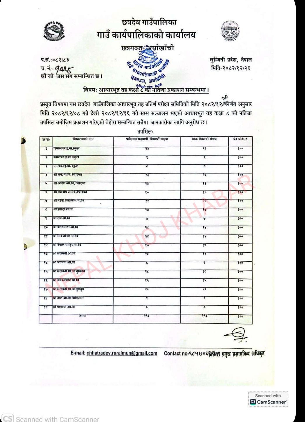 छत्रदेव गाउँपालिकाको कक्षा ८को नतिजामा सहभागी सबै विद्यार्थी उत्तीर्ण