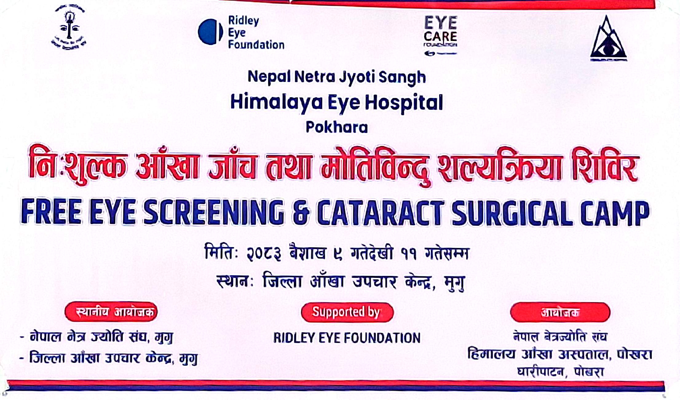 नेपाल नेत्रज्योति संघ हिमालय आँखा अस्पताल घारीपाटन पोखराको आयोजना म रेडले आइ फाउन्डेसन को आर्थिक सहयोगमा म हिमाली जिल्ला मुगुको छायाँनाथ रारा नगरपालिका म निःशुल्क आँखा शिविर वैशाख ९ गतेदेखि ११ गतेसम्म सञ्चालन भएको थियो।उक्त आँखा शिविरमार्फत बिरामीहरूको आँखा परीक्षण गरिएको छ।बैसाख ९गतेदेखि ११ गतेसम्म मुगुको छायाँनाथ रारा नगरपालिका गमगढीमा सञ्चालित शिविरमा ८५० जना बिरामीहरूको निःशुल्क आँखा चेक जाँच गरिएको थियो । उक्त शिविरमा आँखा जाँच गराएका बिरामीहरूमध्ये मा मोतीबिन्दु देखिएका मध्य महिला५४ पुरुष ५२ गरि १०६ जनाको निःशुल्क शल्यक्रिया समेत गरिएको नेपाल नेत्रज्योति सङ्घका केन्द्रीय उपाध्यक्ष तिलक बहादुर मल्ल ले बताउनुभयो।त्यस्तै आँखाका बिरामी र रोगीलाई २५० वटा चस्मा निःशुल्क वितरण समेत वितरण गरिएको मल्ल बताउनुभयो।